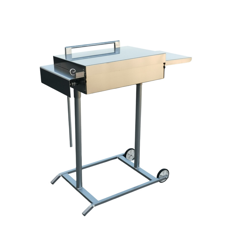 CARATTERISTICHE: Base con ruote, accensione con piezoelettrico, rubinetto con minimo, coperchio para-schizzi, griglia di cottura con pietra ollare con retina spargi fiamma, bicchierino per i grassi, ripiano laterale e manuale d'istruzioni. Possibilità di posizionare la scocca con bruciatore direttamente sulla base, in modo da ottenere un barbecue da tavolo o da camper.