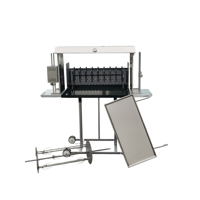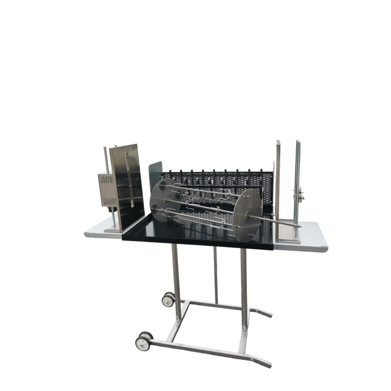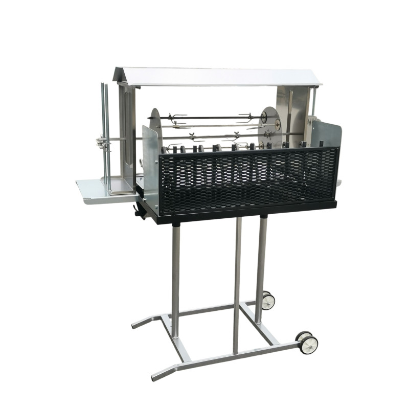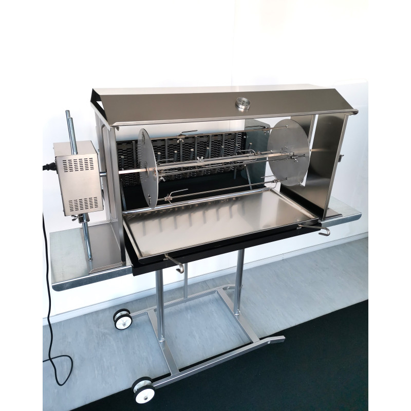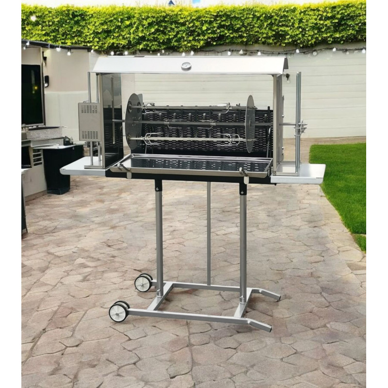 Composto come tutte le altre versioni da una base con doppie ruote, due gambe di sostegno bloccate con viti a galletto ed un ulteriore tubo di supporto posteriore, un piatto sagomato per disporre la brace, un robusto braciere, una lamiera lavorata per convogliare tutto il calore e un rampino tirabrace da 90 cm, viene accessoriato con girarrosto con motore elettrico da 50 W, spiedo in acciaio inox 304, coppia di ganci ferma carne, sistema planetario dotato di 2 dischi Ø cm.29,5, 4 spiedi cm.65 e 4 coppie di ganci fermacarne, lamiere para calore. Il motore, a norma con gli standard europei e le normative CEE, funziona con l'alimentazione a 220V, è azionato da un interruttore con fusibile di sicurezza e compie 2,5 giri al minuto.