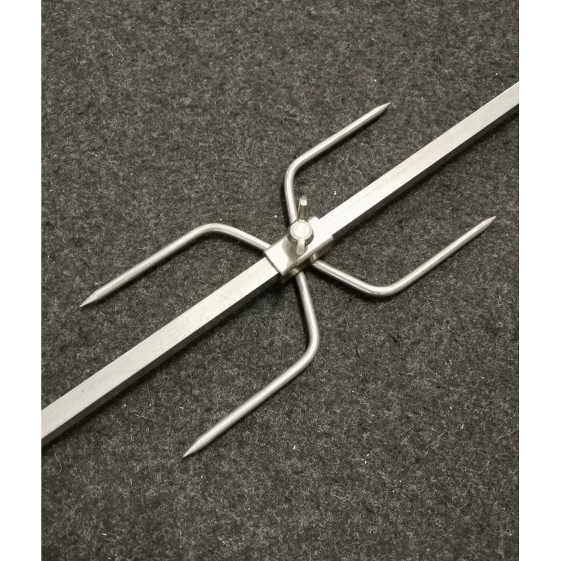 CARATTERISTICHE: Doppie punte che permettono di infilzare agevolmente la carne e galletto di fissaggio per bloccarla allo spiedo.