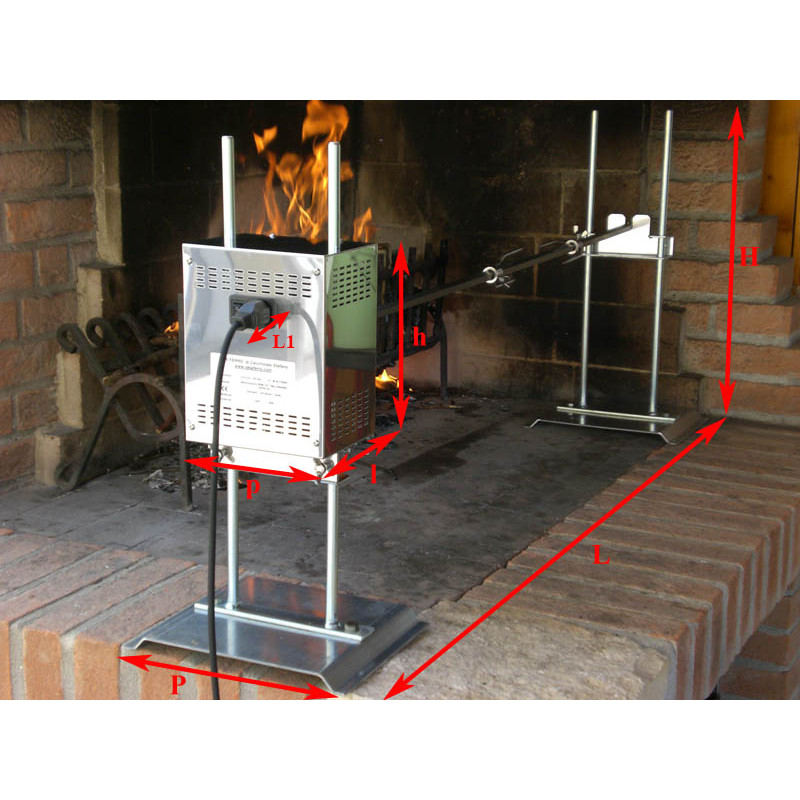 CARATTERISTICHE: Motore da 50W (2,5 rpm, portata massima 25 kg) racchiuso in carcassa forata in acciaio inox 430. Regolabile in altezza. Spiedo in quadro mm. 10 in acciaio inox 304. Coppia di ganci ferma pollo in acciaio inox 304. Cesta Esagonale con divisori interni: cm.L=34 Ø cm.33,5