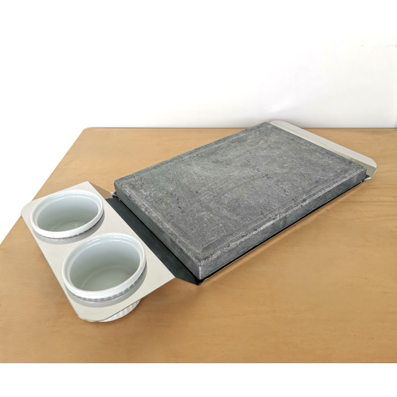 Piatto in acciaio con pietra ollare e porta salse